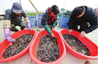 近日,太仓市绿苗农场专业合作社社员正在处理刚从稻田里抓获的泥鳅。据介绍,该合作社在探索“稻蟹共作”中混养了200多亩泥鳅和鲫鱼,目前泥鳅已开始捕捞,并次上市销售,预计亩产量在60斤左右,按目前市价计算,一亩田可增加收入700多元。