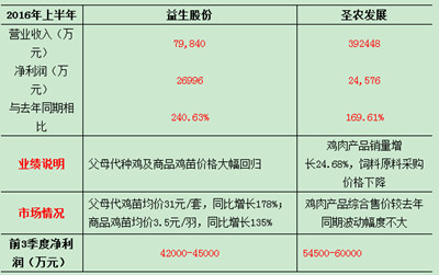 8月2日,圣农发展发布2016年半年度报告,报告称,公司实现营业收入392,448.90万元,较上年同期增长了23.07%,其中:主营业务收入376,091.75万元,同比上升24.62%。报告期内,公司产能按计划持续扩大,与年初相比,期末种鸡存栏数增长28.66%,肉鸡存栏数增长14.76%,鸡肉产品销量较上年同期增加了24.68%。报告期内,营业成本的增幅为7.84%,低于销售量和营业收入的增幅,主要是报告期内白羽肉鸡行业去产能成效开始显现,行情转好,加上主要原料采购价格下降以及公司生产效率提高,公司经营业绩大幅好转。
