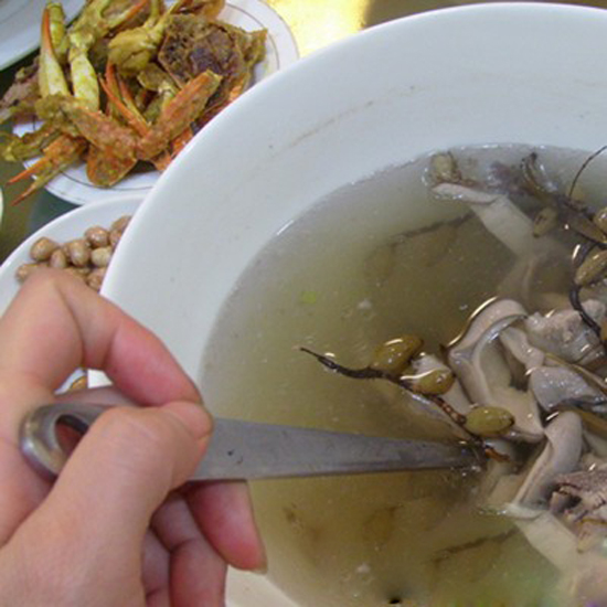 材料:田鸡500克,排骨250克,椰子肉150克,生姜2片,食盐适量。
