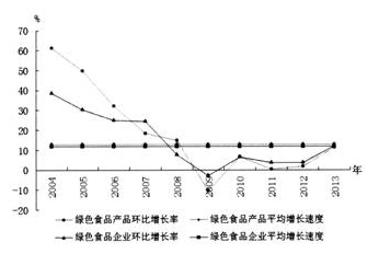 Fig.1 Comparison of growth rate year on year and average annual growth rate of green food enterprises and products, 2004-2013