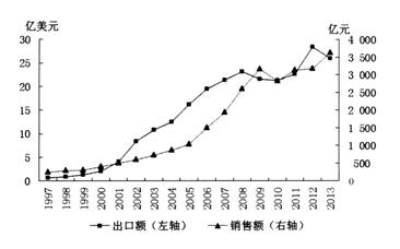 Fig.2 Values of China's green food sale and export, 1997-2013