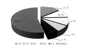 截至2013年底,绿色食品企业中,农业产业化龙头企业达到289家,占2012年龙头企业总数的32.5%;省级农业产业化龙头企业超过了1 300家,约占2012年省级龙头企业的14.9%;截至2013年底,已有1 417个农业专业合作社通过3 044个绿色食品认证,分别占绿色食品企业和产品总数的18.4%和16.0%。来看,绿色食品企业数排名前5位的省份分别是山东、江苏、浙江、黑龙江、河北,其绿色食品企业数量占绿色食品企业总数的46.3%(图3)。