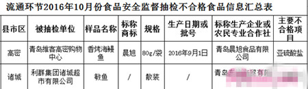 其中,利群集团诸城超市有限公司销售的标称生产企业为青岛东海商贸有限公司的散装敏鱼中氯霉素超标;青岛维客高密购物中心出售的标称生产企业名称为青岛晨旭食品有限公司的香烤海鳗鱼中亚硫酸盐超标。