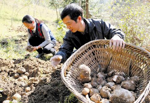 11月2日,在竹溪县泉溪镇益群魔芋专业合作社魔芋种植基地,农民正在采挖魔芋。据了解,目前竹溪县魔芋种植面积约10万亩,总产量达10万吨,生产加工企业达10家,魔芋种植、加工、销售产业链初步形成,成为该县农民脱贫致富的重要产业。