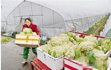 1月8日,东阳市城东街道单良村蔬菜基地里,菜农在收割花菜。受冷空气影响,东阳气温骤降,广大菜农纷纷抢收蔬菜或给蔬菜“穿衣戴帽”,保障蔬菜的供应。