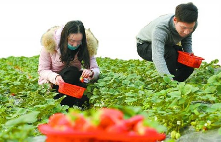 1月20日,道县梅花镇,游客在华胜农场大棚内采摘草莓。