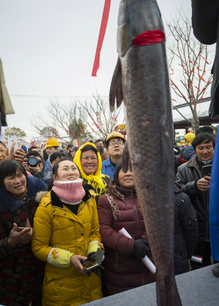 1月27日,人们在捕鱼节鱼王拍卖活动现场观看。
