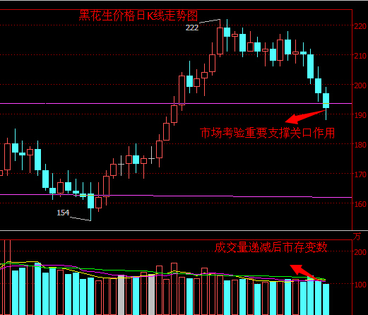 昨日盘中,黑花生价格在下行惯性的带动下进一步走低,至190一线下方暂时止跌,日线收为有影线的小阴线,跌2.54%;行情展望:日线图表上看,行情跌入到190-195关键支撑区间中,市场暂时未有势反弹迹象;但多头未必完全撤离,行情尚有一线生机;若价格短期内回复到200一线上方运行,则阶段性调整结束,上一级别上涨趋势有恢复的可能;日内图表上看,MACD指标开始跌入0轴线下方运行,多头应暂维持观望;K线图表上的小十字线的看涨意义有待后市行情的进一步验证,其有效与否尚难断言;操作建议:激进投资者可尝试以200一线压力为依据逢高短线沽空,并设置严格的止损;稳健投资者可待行情有效突破200一线后入市做多;上方压力位:195、200,下方支撑位:190、185
