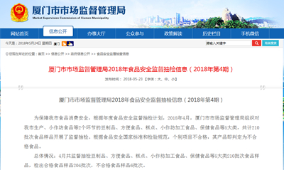 5月23日,厦门市市场监督管理局官网发布2018年第4期食品安全监督抽检信息。2018年4月,厦门市市场监督管理局组织对我市生产、小作坊食品等2个环节的豆制品、方便食品、糕点、小作坊加工食品、保健食品等5大类,共计210批次食品样品开展了监督抽检。根据食品安家标准和检验规范,个别项目不合格,其产品即判定为不合格食品。