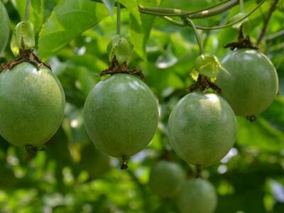 一蓬蓬绿油油的藤蔓爬满棚架,一个个形如鸡蛋的青翠百香果挂满枝头,果香诱人。